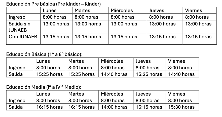 Junto con saludarles y desearles un excelente año, compartimos con ustedes los nuevos horarios de ingreso y salida de clases para este año 2026.